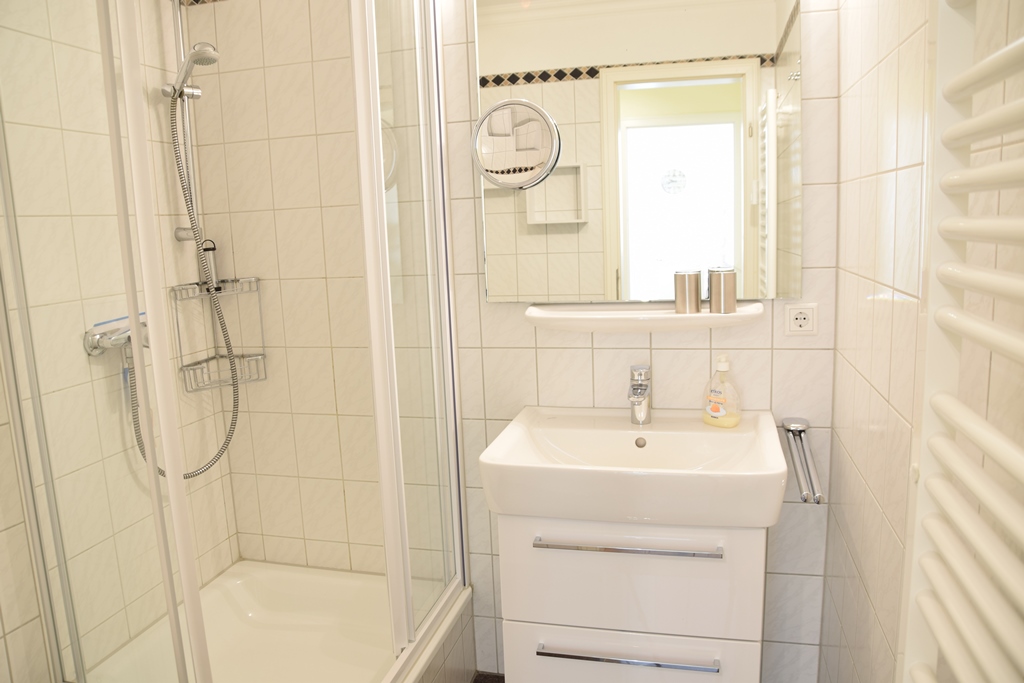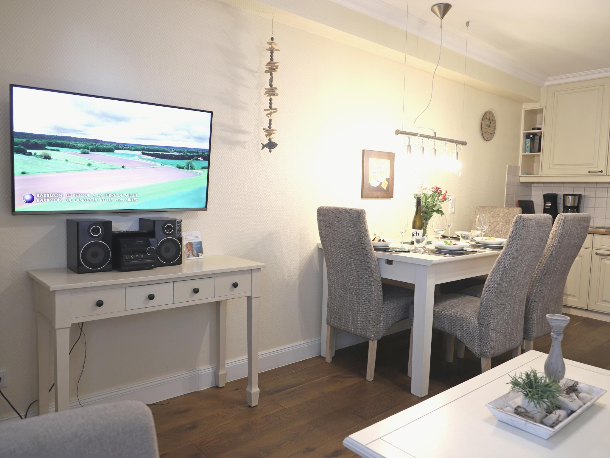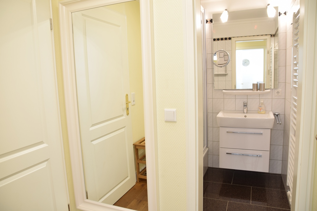 Hochwertige und komfortable 2-Zimmer-Wohnung im Erdgeschoss mit Süd-Terrasse. Wohnzimmer mit Schlafcouch, Flatscreen-TV und Stereoanlage. Die integrierte Küchenzeile ist mit einem 4-Platten-Cerankochfeld, Mikrowelle, Geschirrspüler, Kühlschrank und Kaffeemaschine ausgestattet. Schlafzimmer mit Doppelbett und Flatscreen-TV. Badezimmer mit Dusche und WC. Ein Parkplatz befindet sich auf dem Grundstück. Im Untergeschoss des Hauses steht unseren Gästen eine Sauna mit Dusche gegen Münzeinwurf zur Verfügung. Ebenso können Waschmaschine und Trockner (Münzbetrieb) im Haus genutzt werden . Eigene Terrasse mit Strandkorb. Haustiere nicht erlaubt.