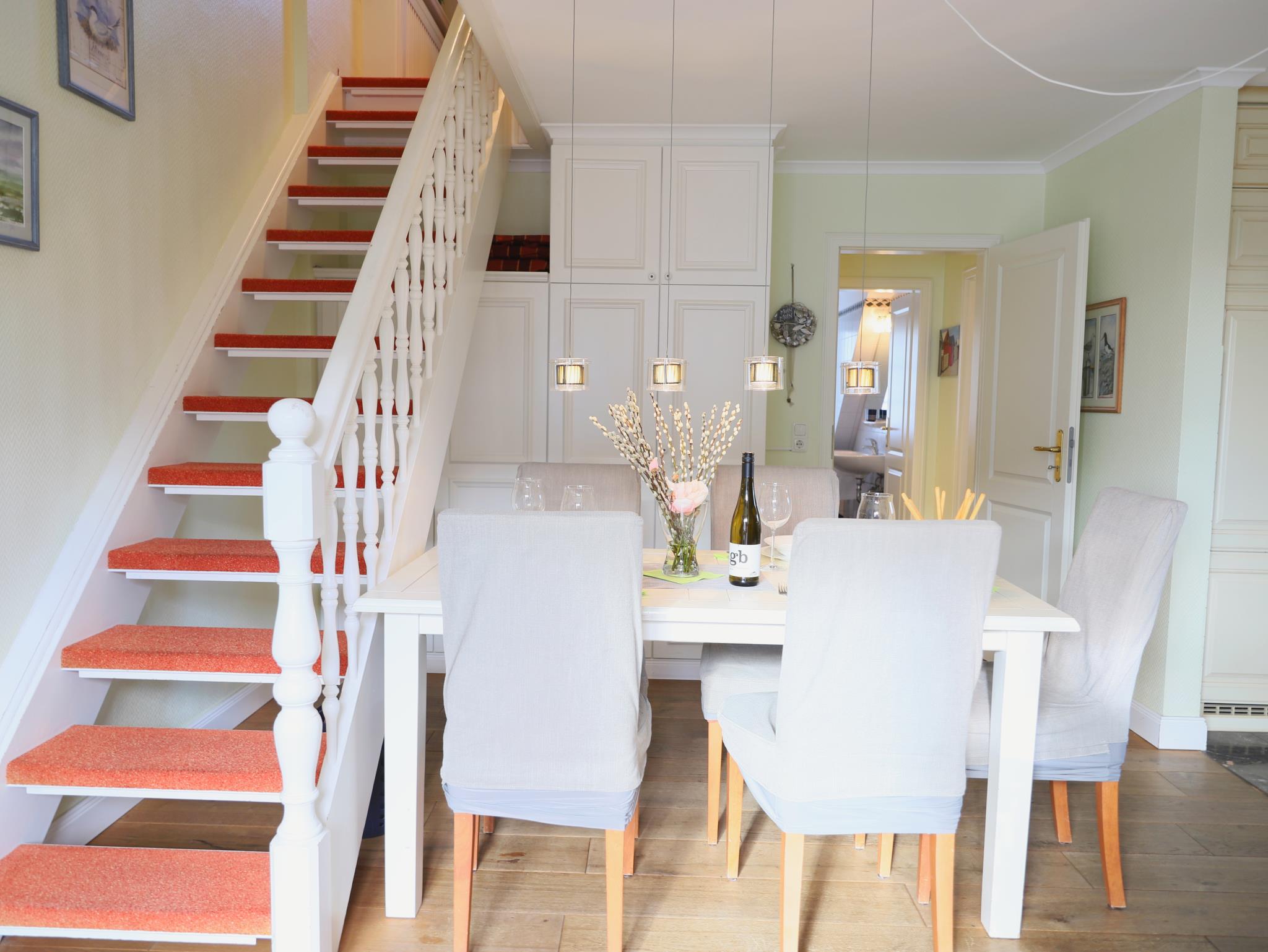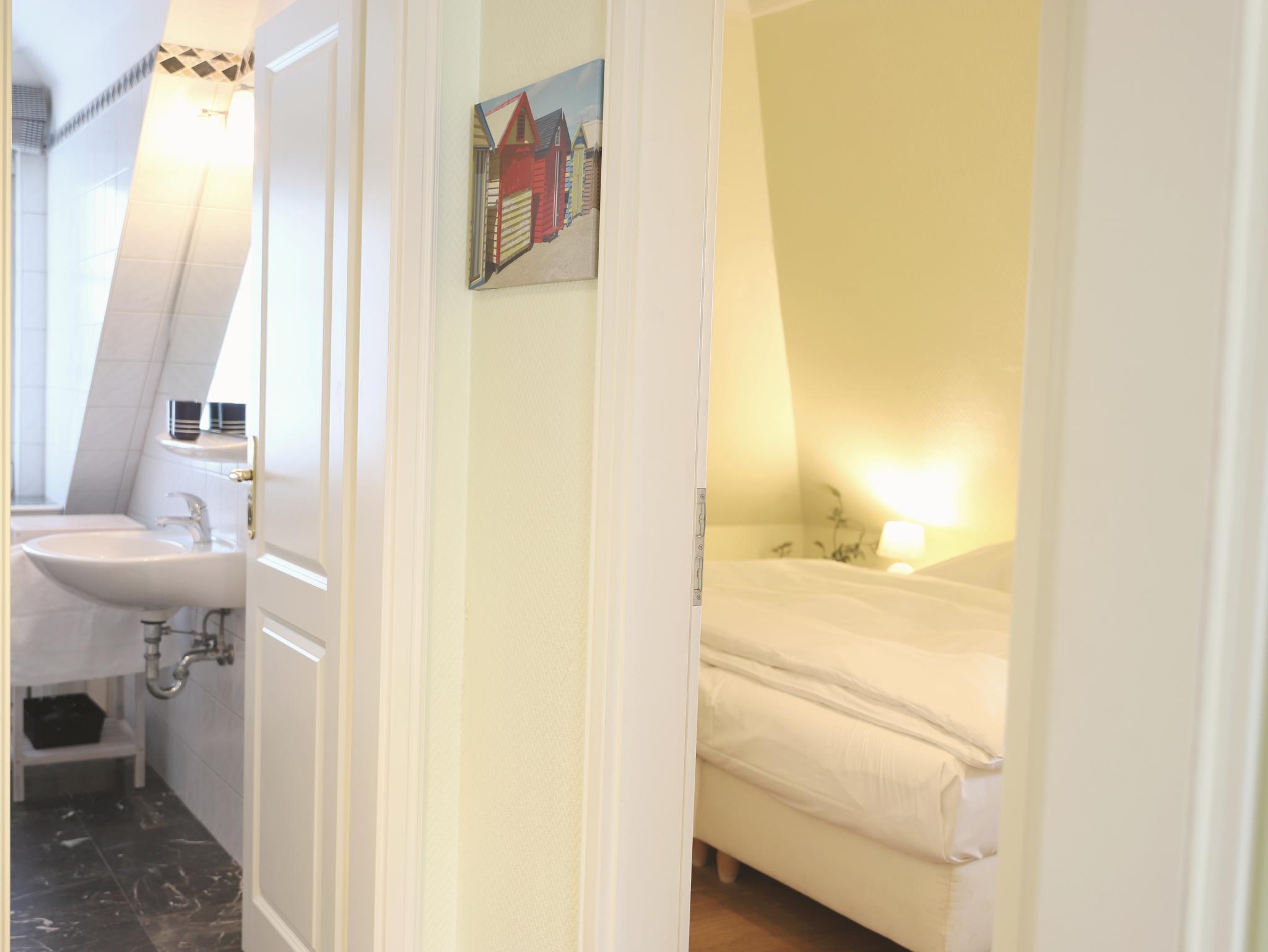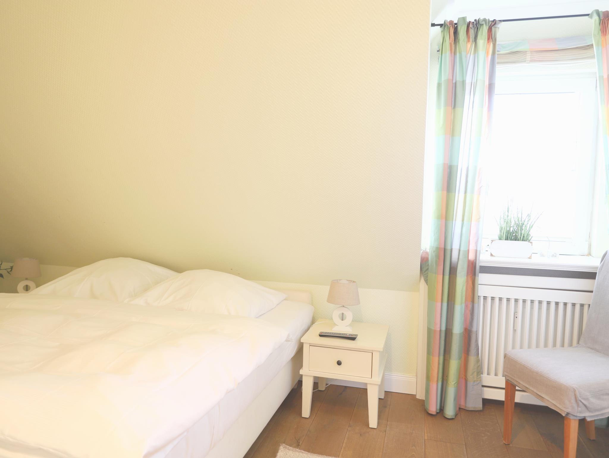 Hochwertige und komfortable 3-Zimmer-Wohnung mit ca. 60 qm im 2. Obergeschoss mit kleinem Süd-Balkon. Wohnzimmer mit Schlafcouch, Sitz- und Essecke, Flatscreen-TV, Stereoanlage und W`lan . Die integrierte Küchenzeile ist mit einem 4-Platten-Cerankochfeld, Mikrowelle, Geschirrspüler, Kühlschrank und Kaffeemaschine ausgestattet. Schlafzimmer mit Doppelbett und Flatscreen-TV. Weiteres Schlafzimmer mit Flatscreen-TV im Spitzboden. Badezimmer mit Dusche und WC. Ein Parkplatz befindet sich auf dem Grundstück. Im Untergeschoss des Hauses steht unseren Gästen eine Sauna mit Dusche gegen Münzeinwurf zur Verfügung. Ebenso können Waschmaschine und Trockner im Haus genutzt werden (Münzbetrieb).Ein schön angelegter Gemeinschaftsgarten mit Strandkörben lädt zum Verweilen ein.