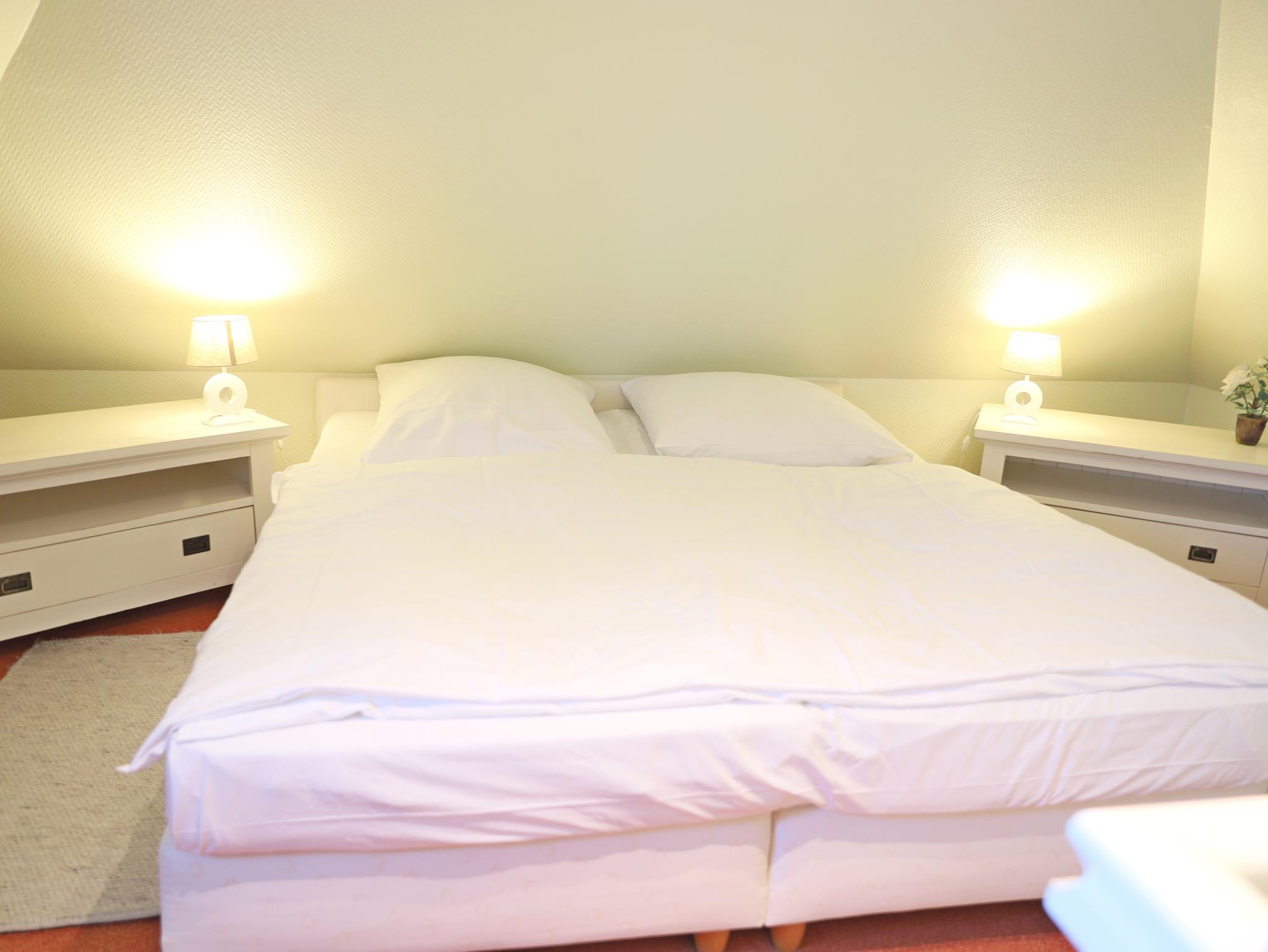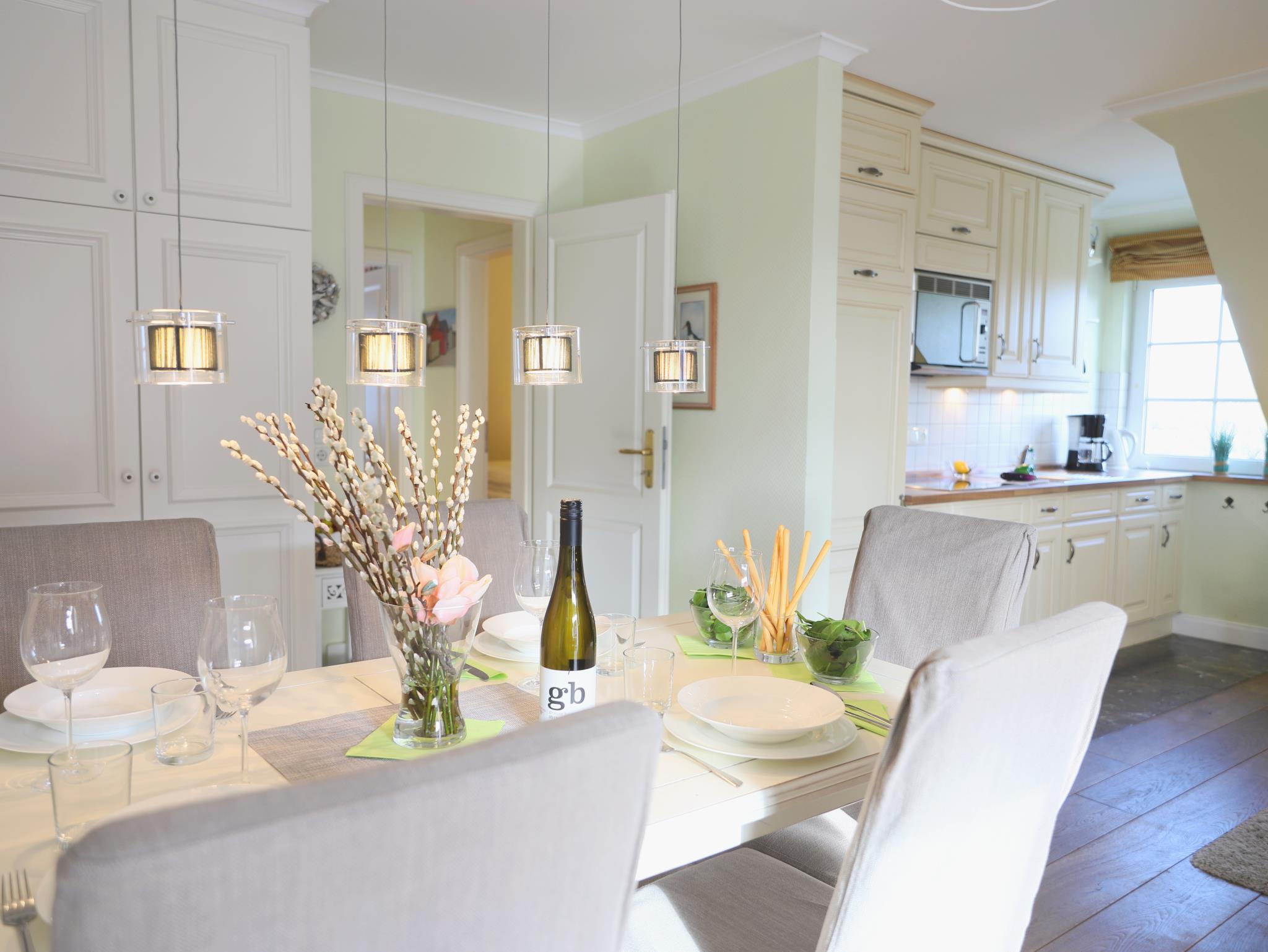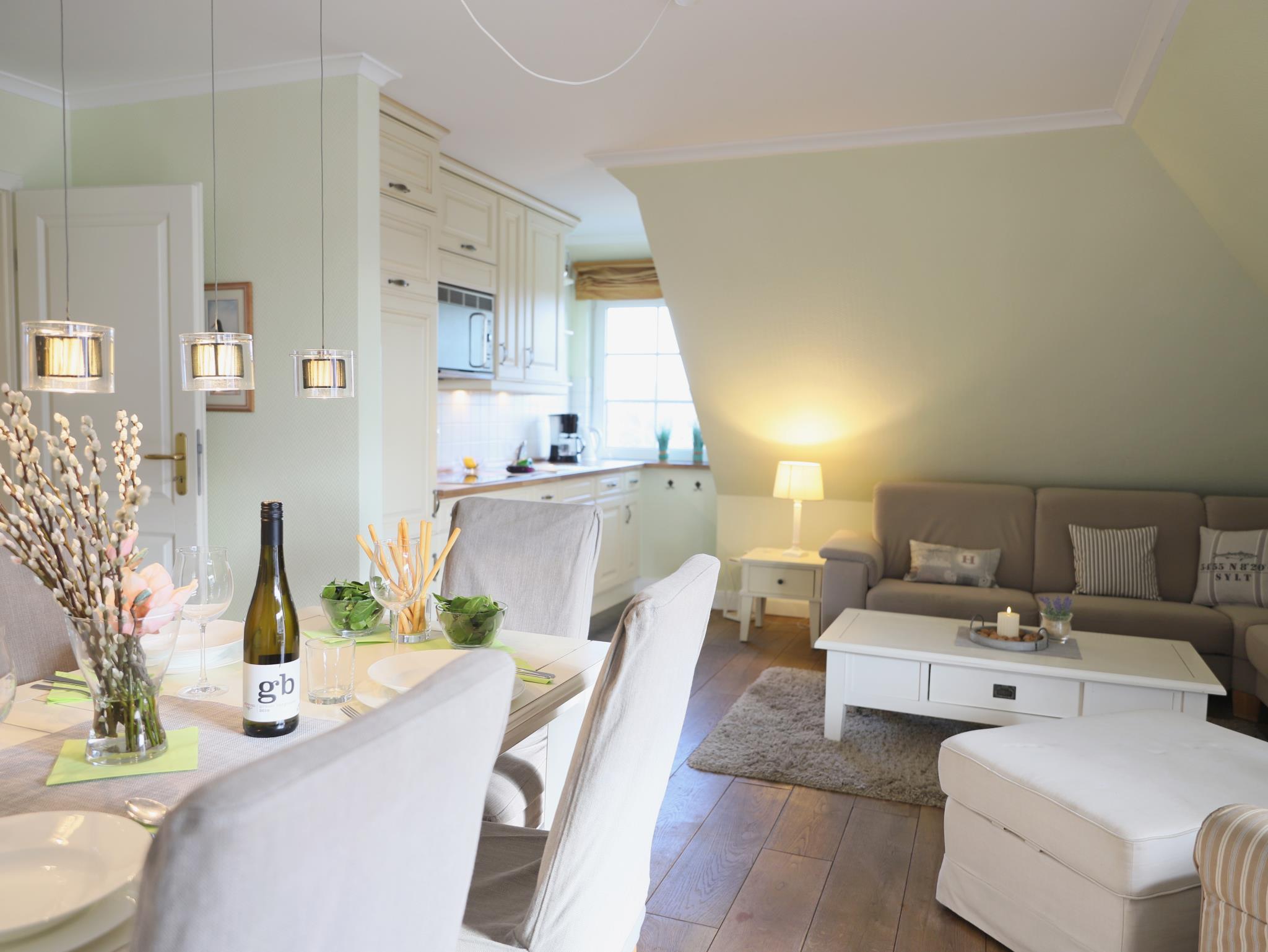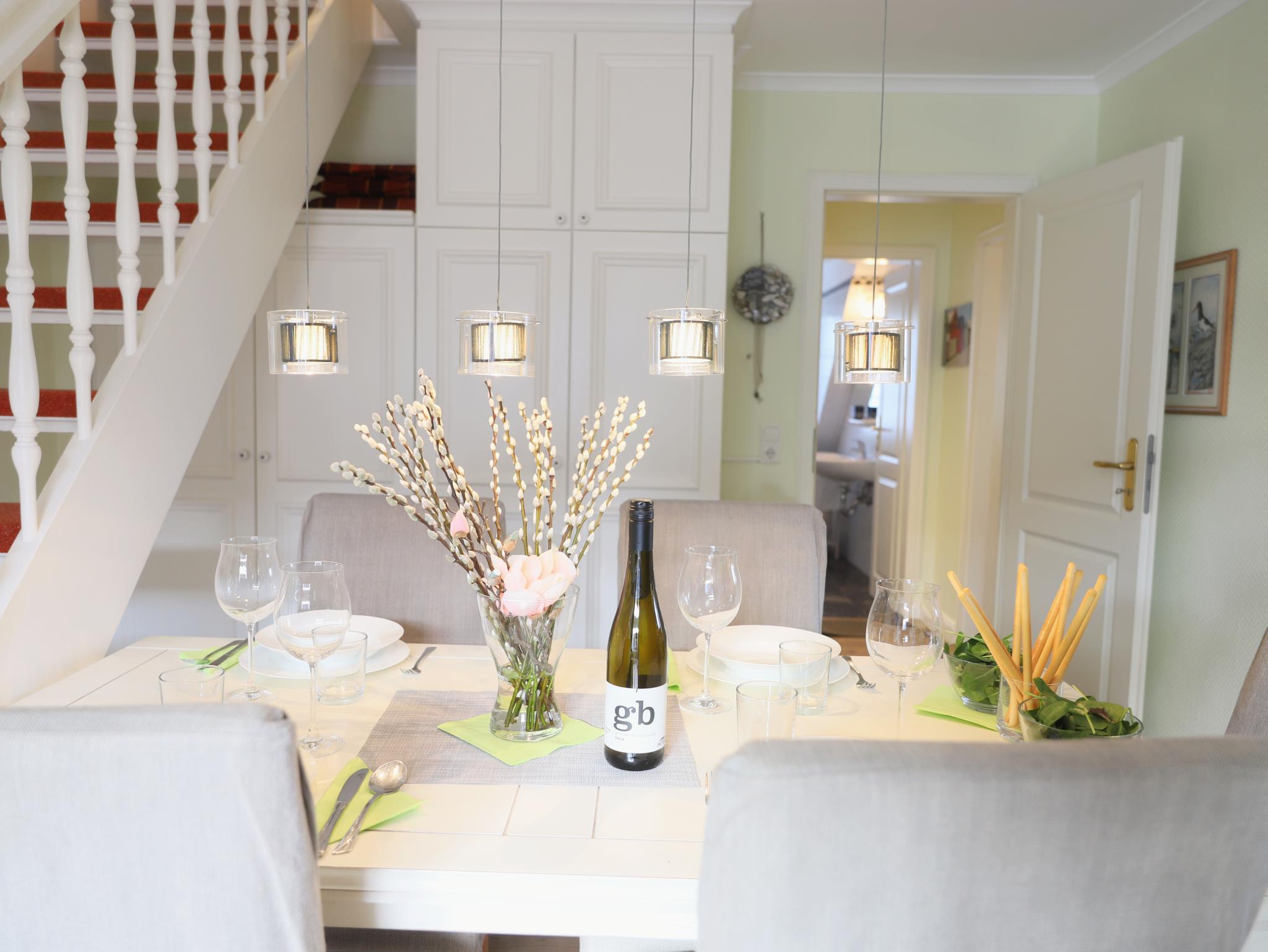 Hochwertige und komfortable 3-Zimmer-Wohnung mit ca. 60 qm im 2. Obergeschoss mit kleinem Süd-Balkon. Wohnzimmer mit Schlafcouch, Sitz- und Essecke, Flatscreen-TV, Stereoanlage und W`lan . Die integrierte Küchenzeile ist mit einem 4-Platten-Cerankochfeld, Mikrowelle, Geschirrspüler, Kühlschrank und Kaffeemaschine ausgestattet. Schlafzimmer mit Doppelbett und Flatscreen-TV. Weiteres Schlafzimmer mit Flatscreen-TV im Spitzboden. Badezimmer mit Dusche und WC. Ein Parkplatz befindet sich auf dem Grundstück. Im Untergeschoss des Hauses steht unseren Gästen eine Sauna mit Dusche gegen Münzeinwurf zur Verfügung. Ebenso können Waschmaschine und Trockner im Haus genutzt werden (Münzbetrieb).Ein schön angelegter Gemeinschaftsgarten mit Strandkörben lädt zum Verweilen ein.