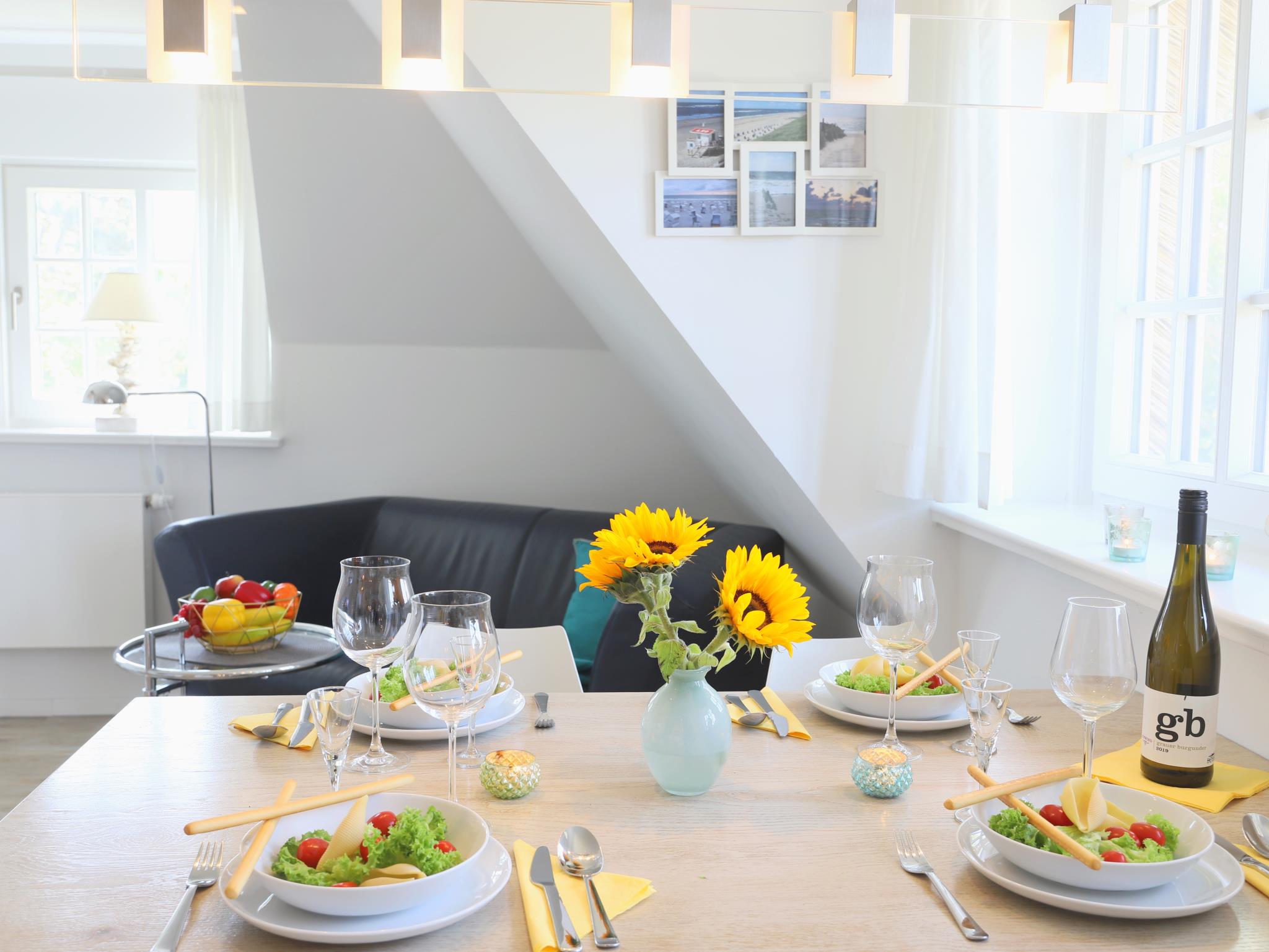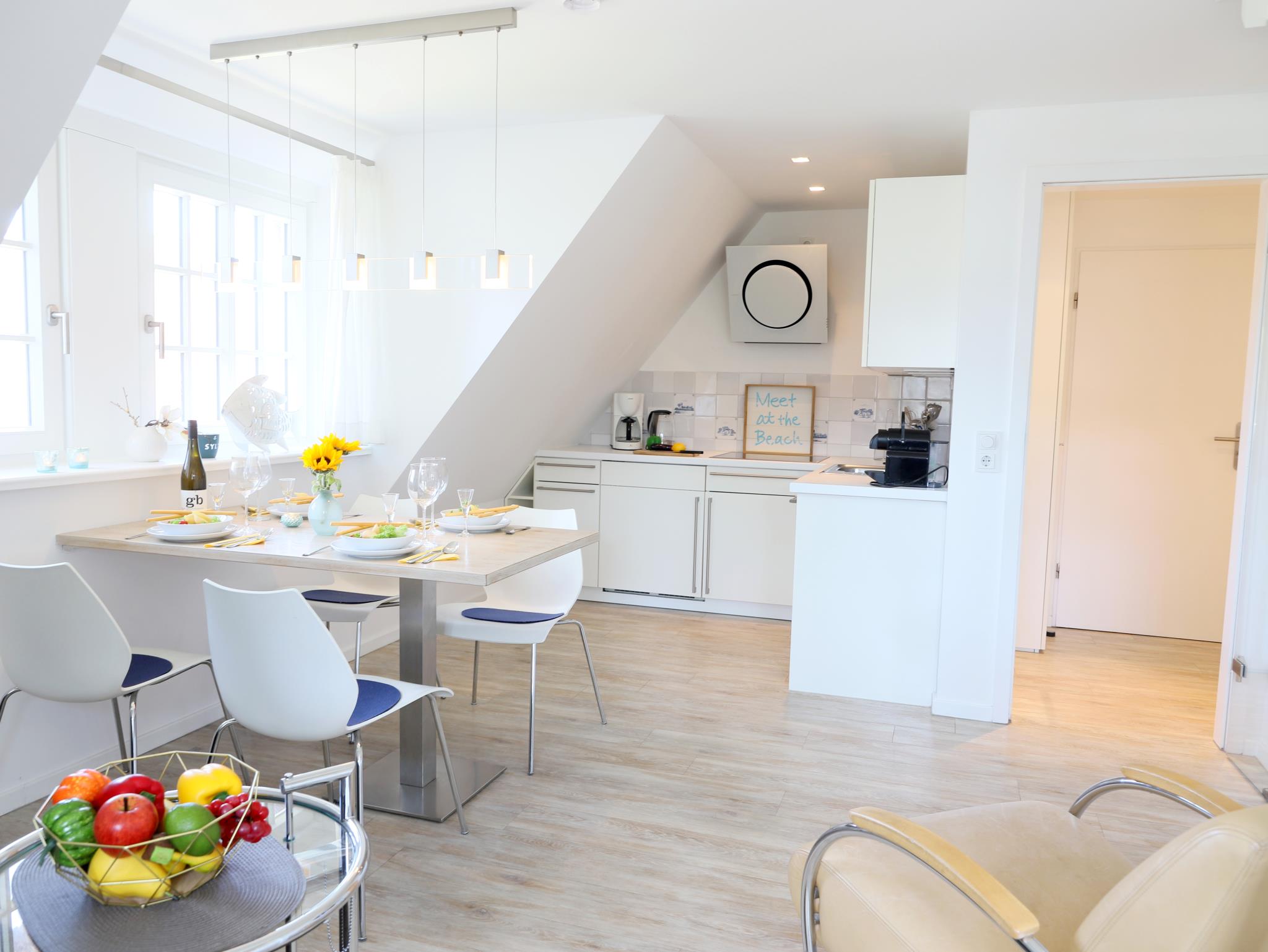 Schöne Reetdachanlage in Westerland in südlicher Richtung gelegen. Die Wohnung ist für 4 Personen. Ideal für 3 Erwachsene mit Kind oder 2 Erwachsene mit 2 Kindern. Der Wohn-/Essraum ist hell lichtdurchflutet und modern eingerichtet. Ein Schlafimmer mit Doppelbett auf gemeinsamer Ebene und ein Schlafraum mit zwei Einzelbetten im oberen Dachgeschoss. Im Außenbereich finden Sie einen Strandkorb und einen Fahrradständerplatz. Von der Wohnanlage erreichen Sie fußläufig bequem die Innnenstadt mit allen Einkaufsmöglichkeiten und Restaurants. Ebenso erreichen Sie über die Nebenstraßen unbeschwert den Strandaufgang zum Westerländer Strand. Ganz in der Nähe erreichen Sie eine Bäckerei und einen Supermarkt (Famila) für die alltäglichen Dinge. Weitere Details zur Wohnung finden Sie unter "Ausstattung".