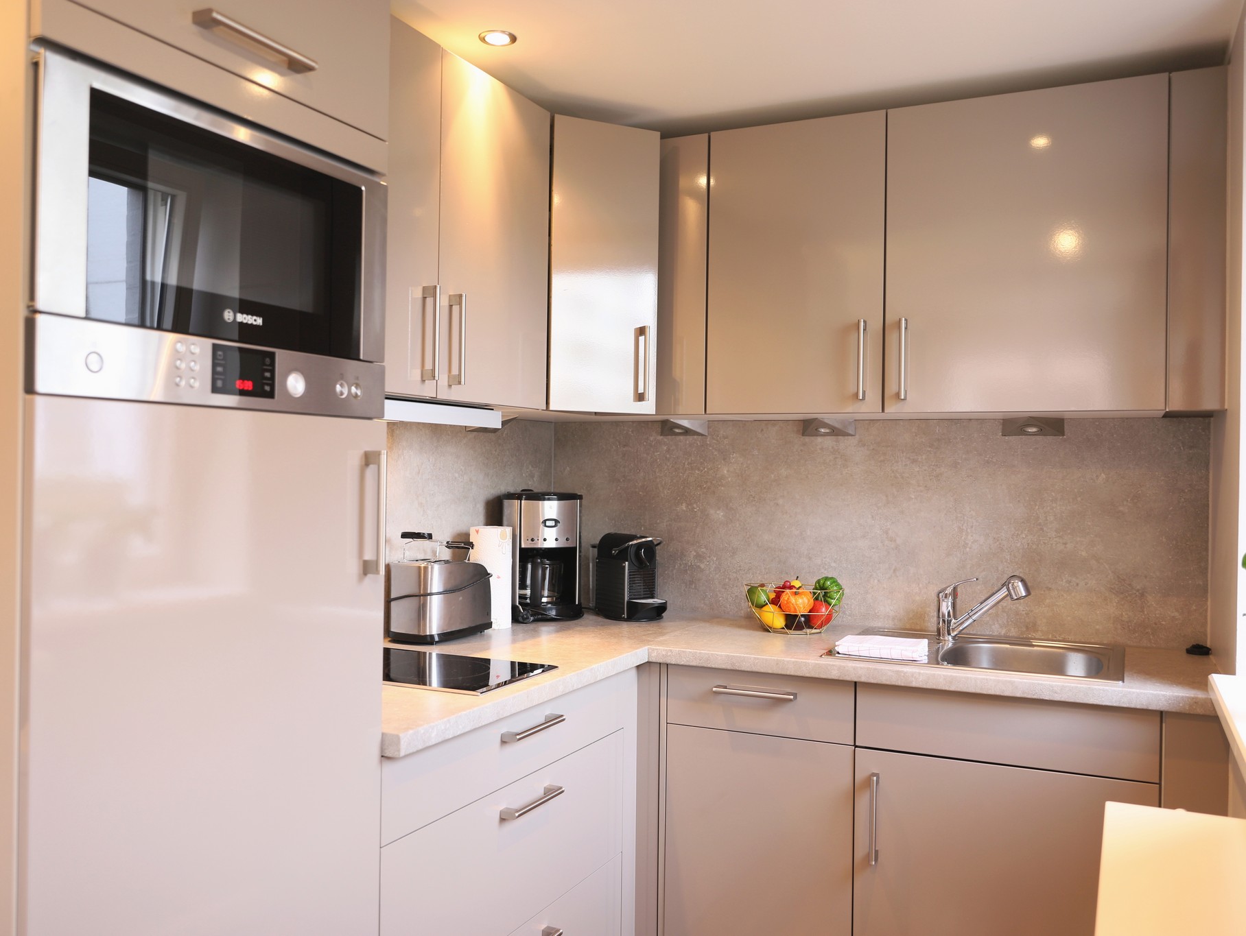 Neues hochwertiges und komfortables 2-Zimmer-Appartement im Erdgeschoss mit Terrasse nach Nord-Osten. Wohnzimmer mit schicker Sitzecke und Schlafcouch. Offene Küche mit Essecke, Geschirrspüler, Backofen und Cerankochfeld. Schlafzimmer mit Doppelbett. Das Badezimmer verfügt über Dusche/WC. Diese Wohnung ist eine Nichtraucherwohnung.